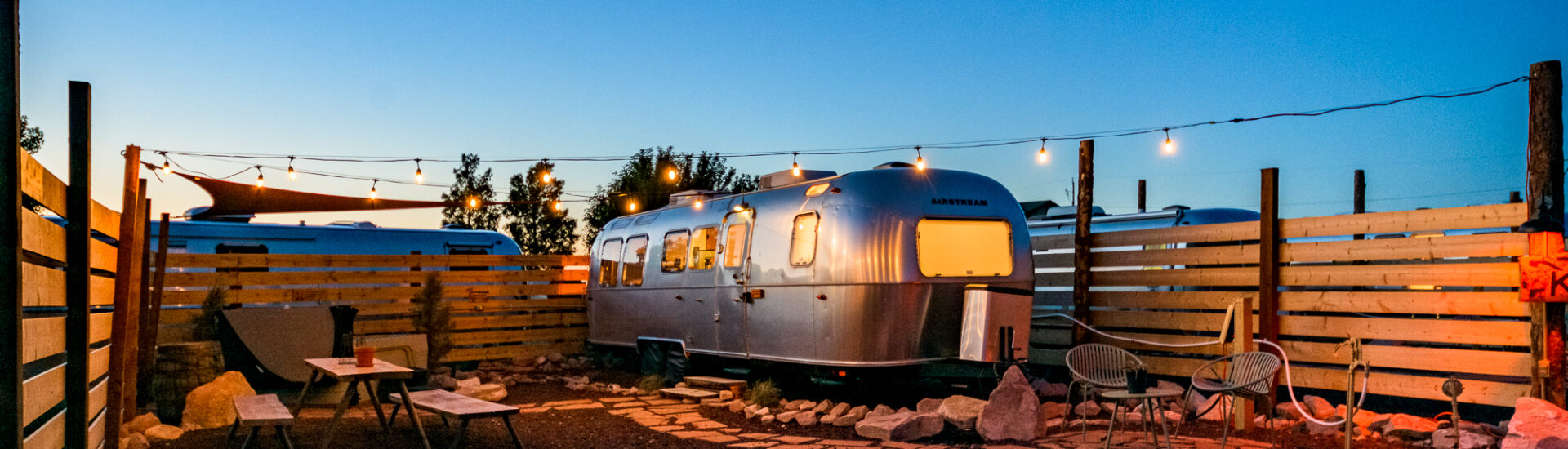 Each of our 12 Airstreams has its own vibe, but include heat, air conditioning and a kitchenette. Some sleep two, others sleep up to six — but all have private hot tubs, picnic tables and fenced patios