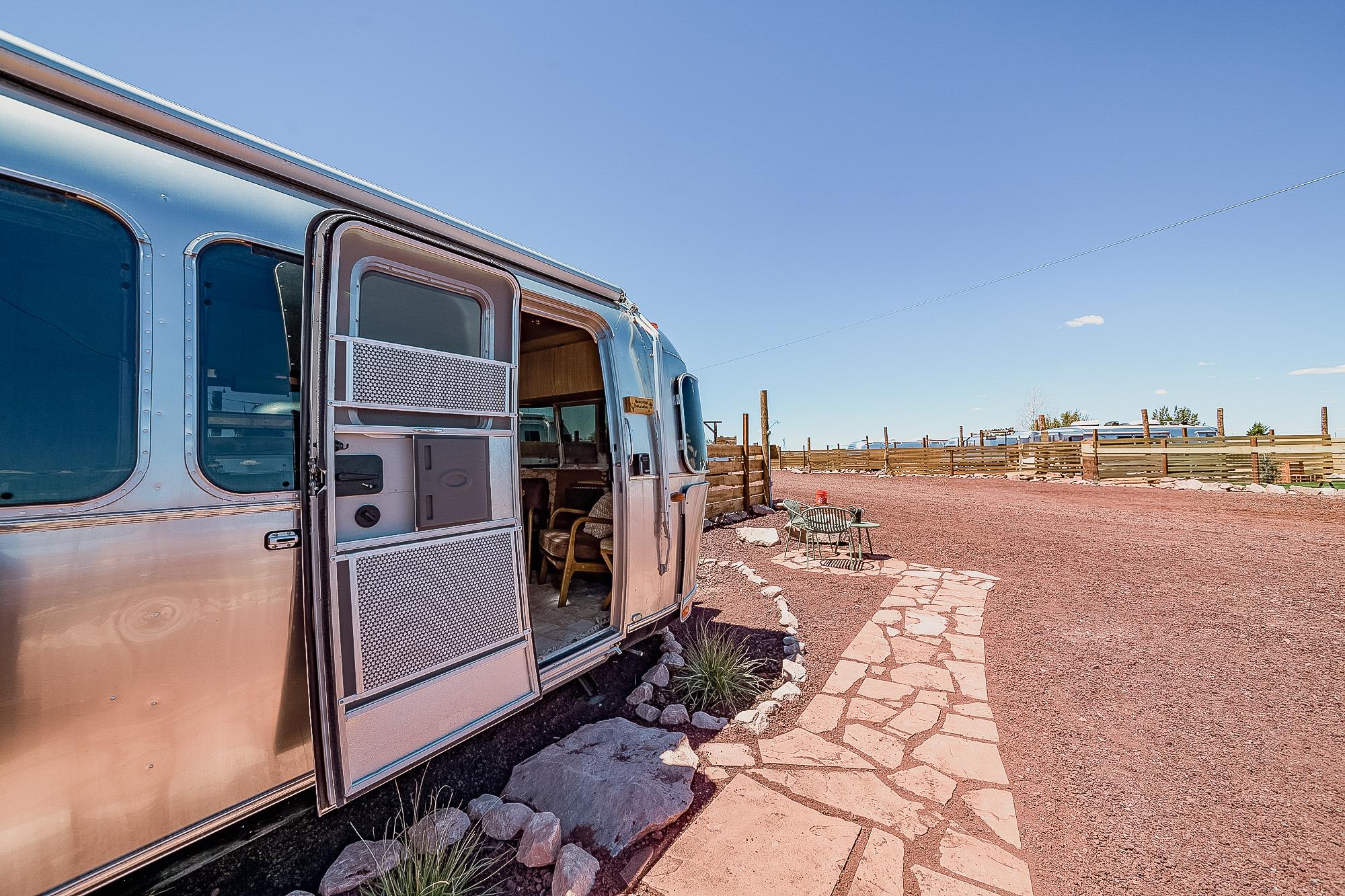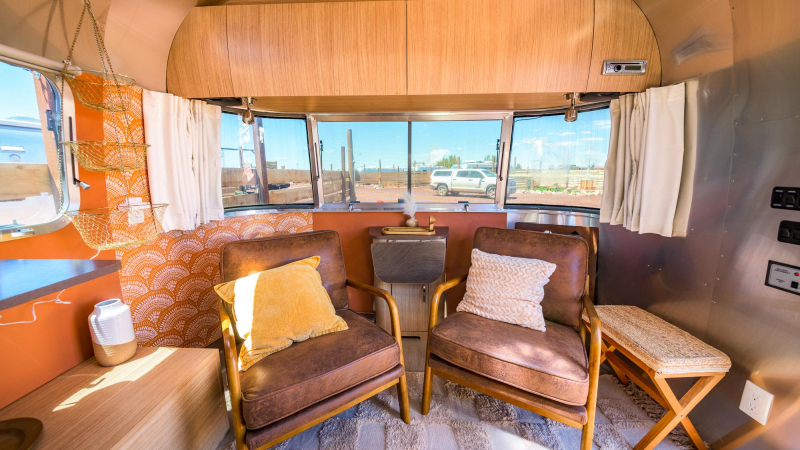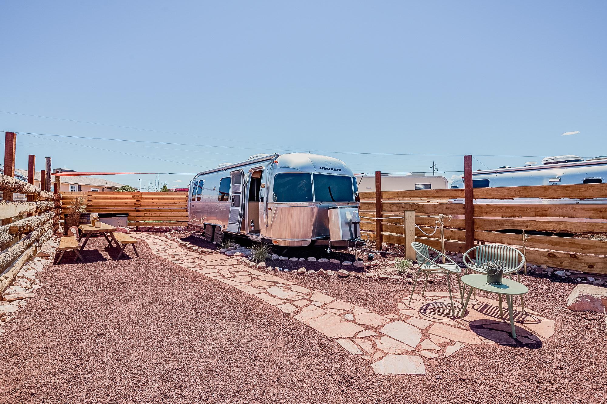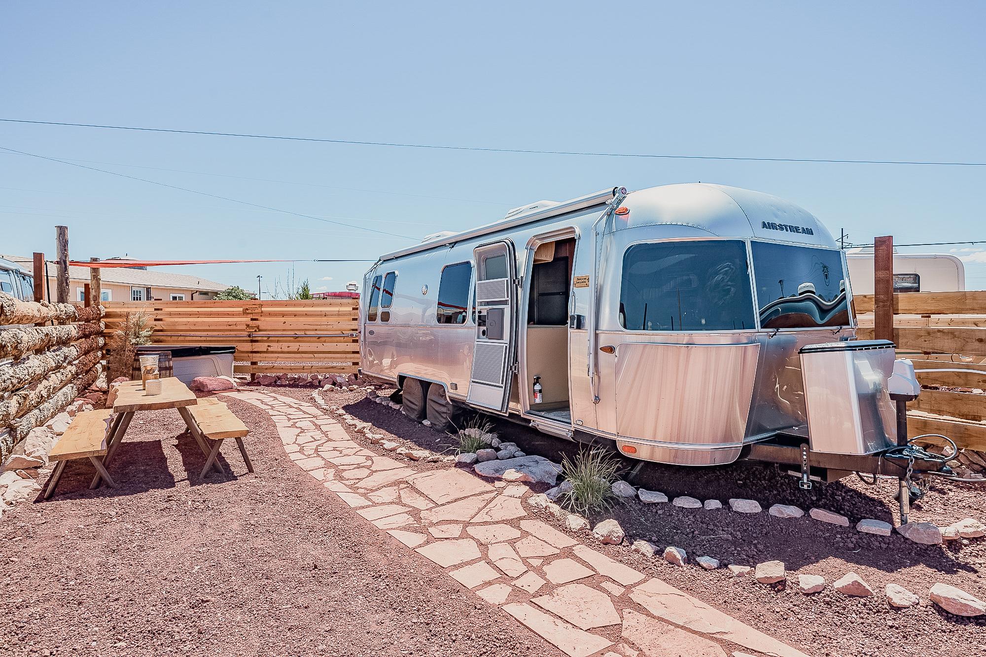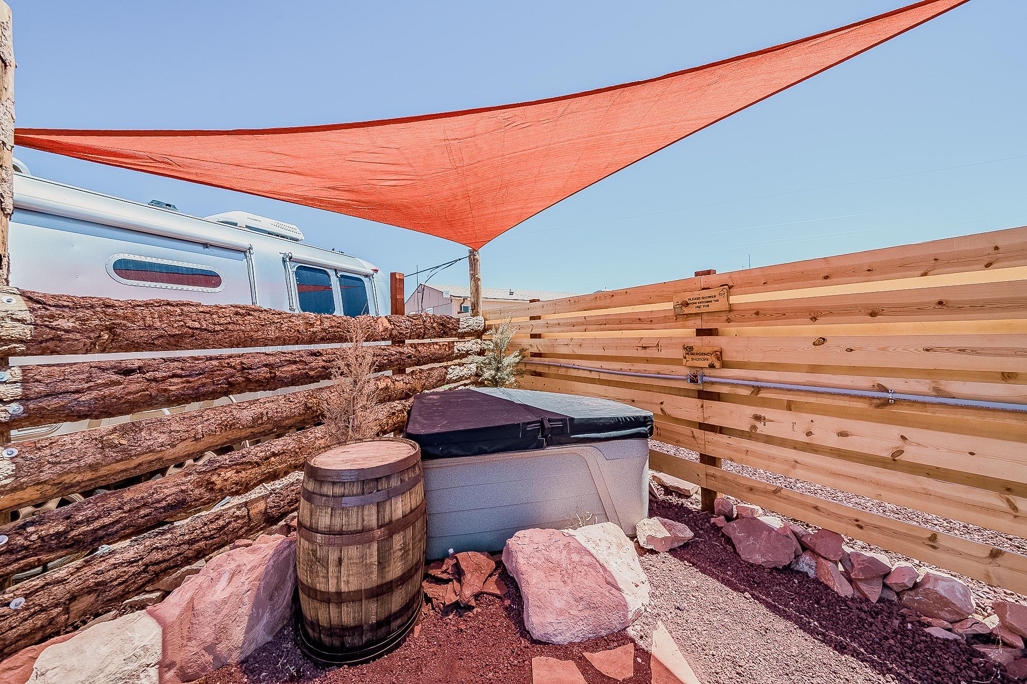 This stylish Airstream is your ultimate glamping escape—complete with your own private hot tub, fenced patio, and outdoor lounge.