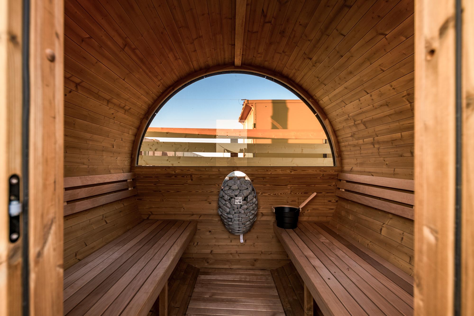 • A communal sauna and outdoor shower